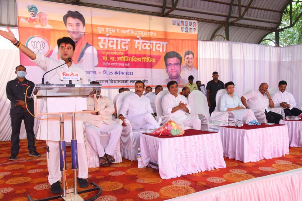 कागल : देशाचे पंतप्रधान नरेंद्र मोदी यांनी लोकसभा प्रवास योजनेअंतर्गत कोल्हापूर जिल्ह्यातील भाजपाचे पक्ष संघटन मजबूत करण्याची जबाबदारी माझ्यावर दिली आहे .देशातील आणि महाराष्ट्रातील परिवर्तनाची जन्मभूमी म्हणून कोल्हापूरची “शाहू भूमी ” ओळखली जाते. त्याअनुषंगाने गेल्या दोन दिवसांपासून भाजपाच्या या मोहिमेला चांगला प्रतिसाद मिळाला आहे. भाजपा हा एक नंबरचा राष्ट्रीय पक्ष आहे. भाजपा च्या आणखी मजबुती करणासाठी 2024 च्या लोकसभा व विधानसभा निवडणुकीत भाजपचा झेंडा फडकवण्यासाठी सज्ज व्हा! असे आवाहन केंद्रीय हवाई उड्डाण मंत्री नामदार ज्योतिरादित्य सिंधिया यांनी केले.