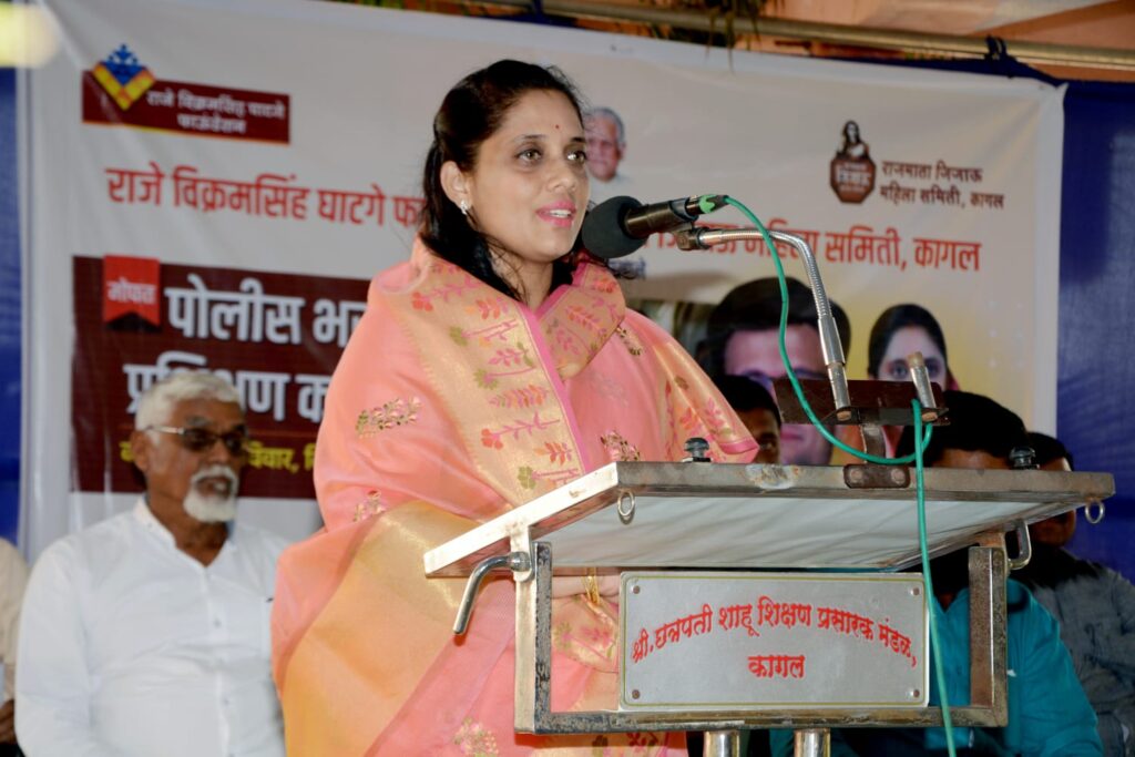 राजे विक्रमसिंह घाटगे फाउंडेशन व राजमाता जिजाऊ महिला समिती यांच्या संयुक्त विद्यमाने श्रीमंत जयसिंगराव घाटगे विद्यामंदिर कागल येथे आयोजित केलेल्या मोफत पोलीस भरतीपूर्व कार्यशाळेत त्या बोलत होत्या. त्या पुढे म्हणाल्या,कागल तालुक्यातील गोरगरीब , दिन दलित विद्यार्थ्यांना एक सक्षम व्यासपीठ उपलब्ध व्हावे या उद्देशानेच राजे फाउंडेशनने ही प्रशिक्षण कार्यशाळा आयोजित केली आहे. याचा पुरेपूर वापर पोलीस भरती व स्पर्धा परीक्षेतील विद्यार्थ्यांनी करून घ्यावा असे आवाहन सौ. घाटगे यांनी केले.या कार्यशाळेमध्ये मैदानावरील प्रात्यक्षिकांसह तज्ञांचे मार्गदर्शनही विद्यार्थ्यांना लाभले.