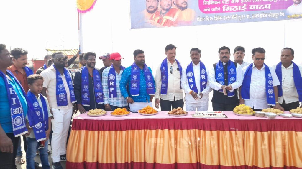 कोल्हापूर : लोकनेते,संघर्षनायक ना.डॉ. रामदासजी आठवले साहेब यांच्या ६३ व्या वाढदिवसा निमित्य हैसाई बंडू आठवले चॅरिटेबल ट्रस्ट कोल्हापूर तसेच रिपब्लिकन पार्टी ऑफ इंडिया(आ) कोल्हापूर जिल्हा च्य वतीने तावडे हॉटेल चौक कोल्हापूर येथे गोडधोड मिठाई चे वाटप करण्यात आले.