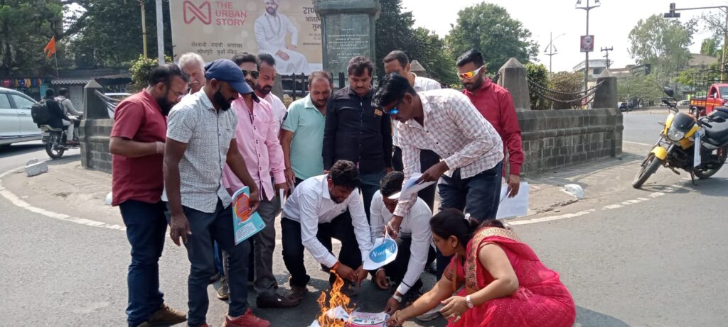 ऐतिहासिक दसरा चौकात आज संभाजी ब्रिगेडच्या वतीने नवनीत प्रकाशनावर कडक कारवाई करावी, या मागणीसाठी आंदोलन करण्यात आले. यावेळी नवनीत प्रकाशनाचे नाव असलेल्या प्रतींचे दहनही करण्यात आले.’जय जिजाऊ जय शिवराय’, ‘संभाजी महाराज की जय ‘ ‘शिवाजी महाराज की जय’ ,’ दहावीच्या विद्यार्थ्यांचे नुकसान करणाऱ्या नवनीत पब्लिकेशनच करायचं काय ,खाली डोक वर पाय ‘ अशा घोषणांनी परिसर दणाणून गेला होता.यावेळी बोलताना संभाजी ब्रिगेडचे जिल्हा संघटक निलेश सुतार म्हणाले, दहावीची परीक्षा सुरू झाली आहे. नवनीत या खाजगी प्रकाशनाने वेळापत्रकात बदल करून 8 मार्चला असणारा पेपर 9 मार्चला टाकून हजारो विद्यार्थ्यांची फसवणूक केली आहे. हे वेळापत्रक चुकीच्या पद्धतीने काढले आहे. कोल्हापुरातही वेळापत्रक मिळाल्यानंतर विद्यार्थी त्याच वेळापत्रकानुसार 9 तारखेला पेपर ला गेले. परंतु पेपरला गेल्यानंतर पेपर 8 तारखेलाच झाल्याचे त्यांना समजले.त्यामुळे प्रचंड खळखळ उडाली, हजारो विद्यार्थ्यांचे नुकसान झाले. त्यामुळे शिक्षण विभागाने नवनीत पब्लिकेशन ची चौकशी करून कडक कारवाई करावी, अन्यथा संभाजी ब्रिगेड स्टाईलने तीव्र आंदोलन करण्याचा इशाराही यावेळी संभाजी ब्रिगेडकडून देण्यात आला आहे.यावेळी या आंदोलनात भगवान कोइंगडे, कुवरसिंह भोसले, सचिन गुरव, अजित मडके, उदयशंकर घाटगे, गणेश सुतार, महेश गुरव, दीपक गुरव, अमित आयघोळ, धनाजी कांबळे, भारत सुतार सहभागी झाले होते.