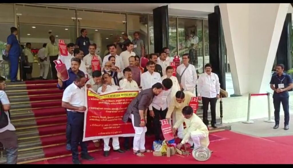 मुंबई : अर्थसंकल्पीय अधिवेशनाच्या कामकाजाचा आजचा बारावा दिवस असून विरोधी पक्षनेते अजित पवार आणि अंबादास दानवे यांच्या नेतृत्वाखाली महाविकास आघाडीच्या आमदारांनी विधानभवनाच्या पायर्यांवर चूल रचत त्याच्यावर प्रतिकात्मक सिलेंडर ठेवून गॅस दरवाढ आणि महागाईचा निषेध केला. महाविकास आघाडीच्या आमदारांनी विधानभवनाच्या पायर्यांवर चूल रचत त्याच्यावर प्रतिकात्मक सिलेंडर ठेवून गॅस दरवाढ आणि महागाईचा निषेध केला.