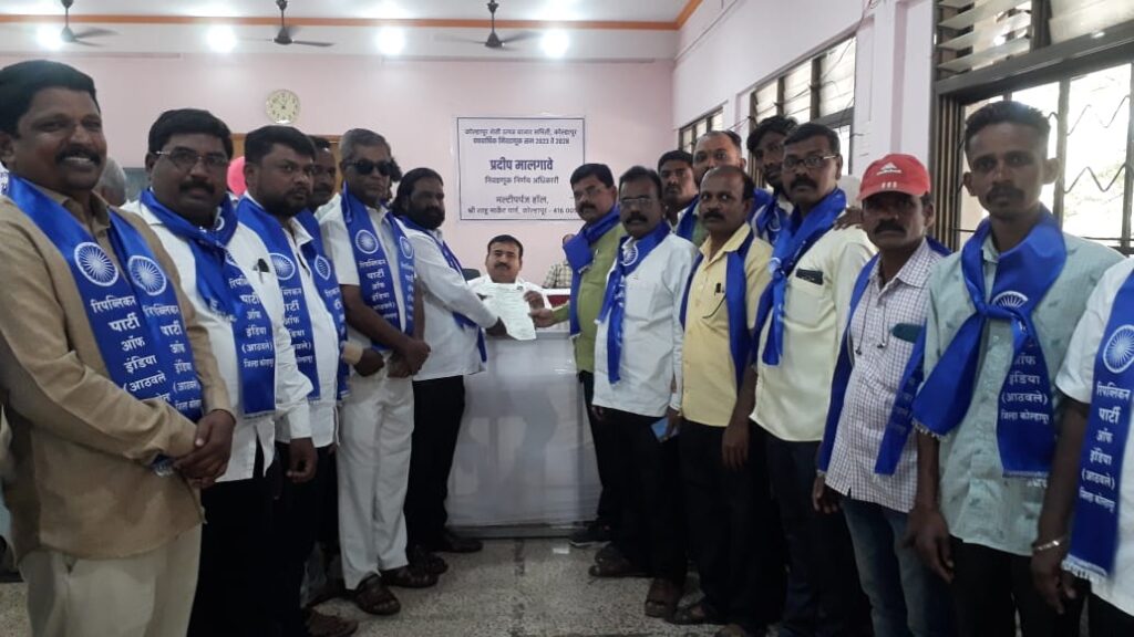 कोल्हापूर: कोल्हापूर जिल्हा शेती उत्पन्न बाजार समितीची 2023-2028 सालाकरिता पंचवार्षिक निवडणूक जाहीर झाली असून आपले उमेदवारी अर्ज भरण्यासाठी बाजार समिती प्रशासकीय कार्यालयामध्ये अनेक राजकीय पक्ष व संघटनांच्या प्रतिनिधींची झुंबड उडाली आहे. आज रिपब्लिकन पार्टी ऑफ इंडियाचे आठवले गटाचे कोल्हापूर जिल्हाध्यक्ष उत्तमदादा कांबळे यांनी मोजक्या पदाधिकारी व कार्यकर्त्यांसहित अनुसूचित जाती जमाती व सर्वसाधारण प्रवर्गातून आपला उमेदवारी अर्ज निवडणूक निर्णय अधिकारी प्रदीप मालगावे यांच्याकडे सादर केला.