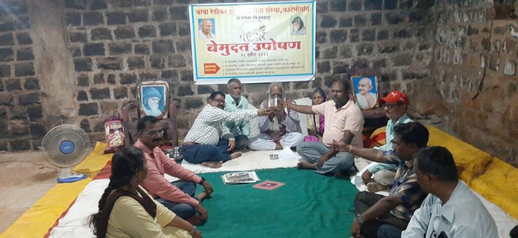 कोल्हापूर : गेल्या 18 एप्रिल 2023 भूदान दिवसापासून बाबा रेडीकर गो गीता सेवा संस्थेच्या गाईंना चाऱ्यासाठी जमीन व पशुसंवर्धन विभागाकडून अर्थसहाय्य अनुदान मिळावे, गाईंना पिण्याच्या पाण्याची व्यवस्था व्हावी, जळालेल्या वैरणीची नुकसान भरपाई मिळावी या मागण्यांसाठी संस्थेचे संस्थापक अध्यक्ष आबा कांबळे यांनी बेमुदत उपोषण सुरू केले होते. गायींना तहसीलदार पन्हाळा यांचे वतीने बाजार भोगाव सर्कल ऑफिसर बी एस खोत यांनी गट नंबर 600 सरकार हक्कातील जमीन तुम्ही चाऱ्यासाठी वापरू शकता, त्याचबरोबर ही जमीन तुम्हाला भाडेतत्त्वावर देण्याचे दृष्टीने प्रशासन प्रयत्नशील राहील, पशुसंवर्धन विभागाकडे मागितलेले अनुदान मिळण्यासाठी शासन स्तरावर प्रयत्न करू असे आश्वासन दिले. तीव्र पाणीटंचाई झाल्यामुळे गाईंना पावसाळा येईपर्यंत पाणी देण्यासाठी कोल्हापूर जिल्ह्यातील लोकप्रिय जिल्हाधिकारी राहुल रेखावर यांनी विशेष लक्ष घातल्यामुळे पन्हाळ्याचे गटविकास अधिकारी सुभाष सावंत यांनी लेखी निवेदन दिल्यानंतर दिनांक 20 /4 /2023 रोजी सायंकाळी 7:15 वाजता काटेभोगाव चे सरपंच रवींद्र पाटील सामाजिक कार्यकर्ते सरदार आंग्रे बीडिओ सुभाष सावंत यांचे हस्ते लिंबू सरबत घेऊन उपोषण समाप्त केले.
