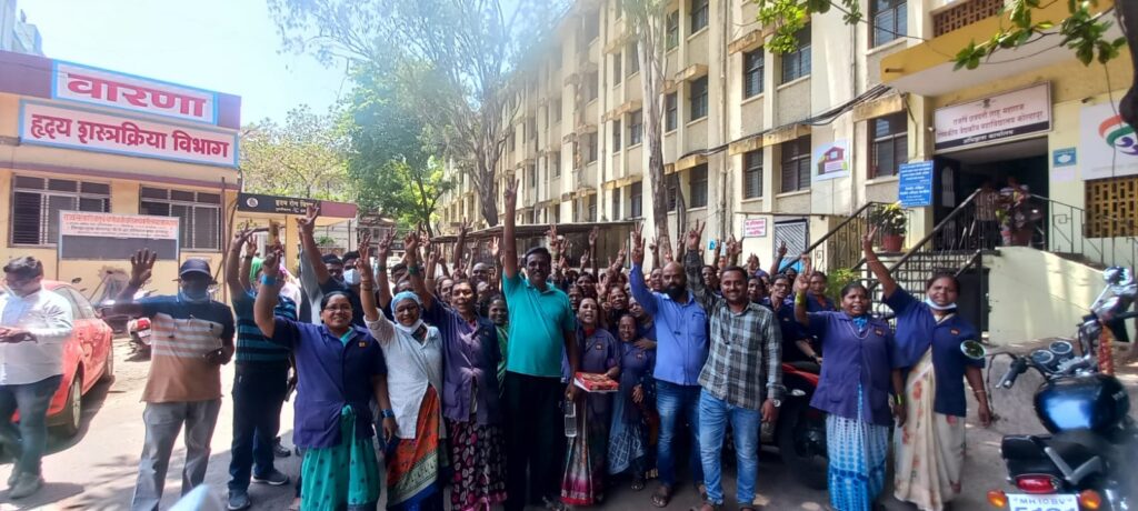 यावेळी आनंद उत्सव साजरा करताना विजयाच्या घोषणा देण्यात आल्या.यावेळी सफाई कामगार अनिल माने, अरुण कांबळे, राहुल धनवडे, मनीषा चव्हाण,लता माळगे, विमल कांबळे, सुनीता फुटाणे, सुजित सावंत,राहुल वायदंडे, कुमार कांबळे, रोहन कांबळे, रोहित सावंत, चेतन कट्टी, नीता चव्हाण, दिपाली डाकवे, पद्मा मुदाळे गोपीनाथ कांबळे,अरुण कांबळे,शंकर कांबळे,पद्मा मुसाळे,रोहिणी कांबळे,नग्मा मकानदार,मनिषा पोवार, वत्सला शिंदे,उमा मेस्त्री,सविता पोवार आदी सह महिला सफाई कर्मचारी उपस्थित होत्या.