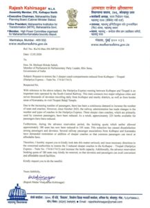 यामुळे प्रवाशांची अत्यंत गैरसोय होत असून, याप्रकरणी गांभीर्याने लक्ष घालून कोल्हापूर – तिरुपती (हरिप्रिया एक्स्प्रेस – ट्रेन क्र. १७४१६/१७४१५) मधील कपात केलेल्या ३ स्लीपर कोच डब्यांची संख्या पूर्ववत करून बर्थची संख्या वाढवावी आणि आगाऊ आरक्षण कालावधीतील १८० सीट्स बुकिंगची संख्या पूर्ववत करणेबाबत आपल्या स्तरावरून संबधितांना आवश्यक सूचना द्याव्यात, अशी मागणी राज्य नियोजन मंडळाचे कार्यकारी अध्यक्ष आमदार राजेश क्षीरसागर यांनी शिवसेना पक्षाचे संसदीय गटनेते खासदार डॉ.श्रीकांत शिंदे यांच्याकडे लेखी पत्राद्वारे केली आहे.